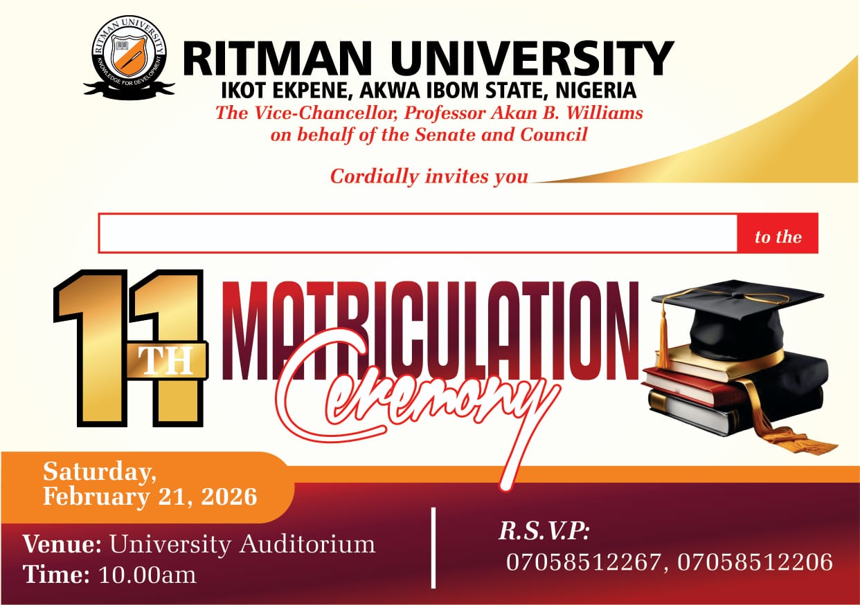 The Vice-Chancellor, Professor Akan B. Williams, on behalf of the Senate and Council of Ritman University, Ikot Ekpene, Akwa Ibom State, Nigeria, hereby announces the 11th Matriculation Ceremony of the University.